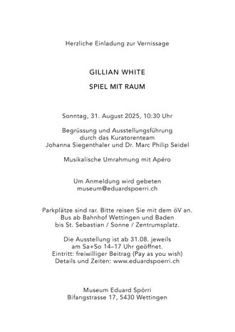 Am 31. August 2025 eröffnet im Kunst Museum Eduard Spörri die Sonderausstellung «Spiel mit Raum» und stellt das Werk der Wahlaargauer Künstlerin Gillian White (*1939) ins
